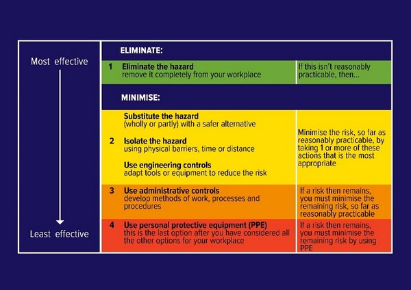 Controls can be ordered from most effective to least. This is called the “Hierarchy of Controls”. The better the controls used, the lower the level of risk. The most effective control is to eliminate, the least is to just use PPE. Substitute, isolate and engineer are classed as being as equally effective. You will often need to use multiple controls on a single risk.